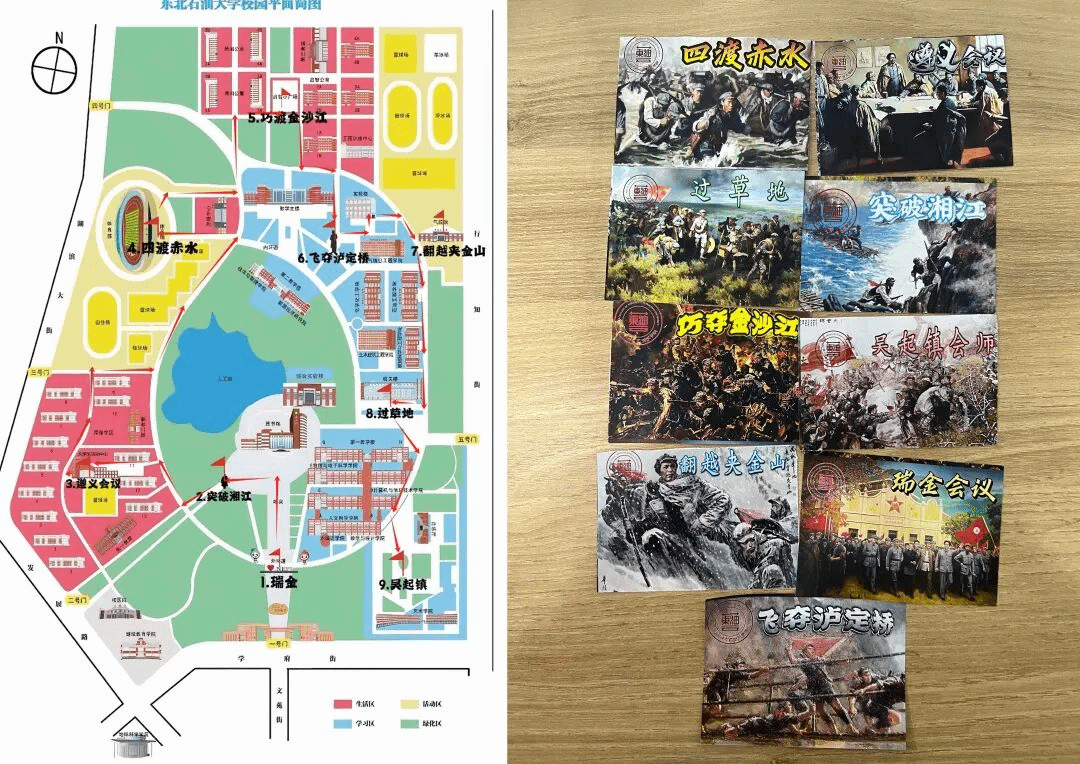 此次活动路线选取了长征途中具有代表性的一段路程,首先从校园正门“瑞金”开始第一站,到达校园铁人纪念雕像,代表着“湘江”,突破“湘江”后抵达“遵义”开启“长征”转折点,随后通过“赤水”,“金沙江”,“泸定桥”,“夹金山”,“过草地”最终抵达“吴起镇”并回到米乐mile体育官网。每一段长征路上的关卡都在校园环路上一一体现。一路上,同学们沿着红军当年的足迹前行,在校园的环路里感受着那段波澜壮阔的革命历史。
