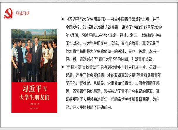 本次活动分别讲述了“机关年轻干部要多到基层去磨炼、去接地气”;“基层工作要有兴趣、有热情,要有韧性、有耐力”;“志存高远、脚踏实地、行循自然”;“‘年轻人要自找苦吃’,要‘老老实实地调研’”;“听总书记的话,在志愿服务中练就过硬本领”和“勤学修德,用行动书写自己的人生答卷”六个部分。同学们参与发言,归纳总结,通过各班团支书对这本书细致的讲解,同学们能够更清楚地了解习近平总书记对青年们的关爱与期望。本次活动也因同学们的积极参与取得了良好的反响。