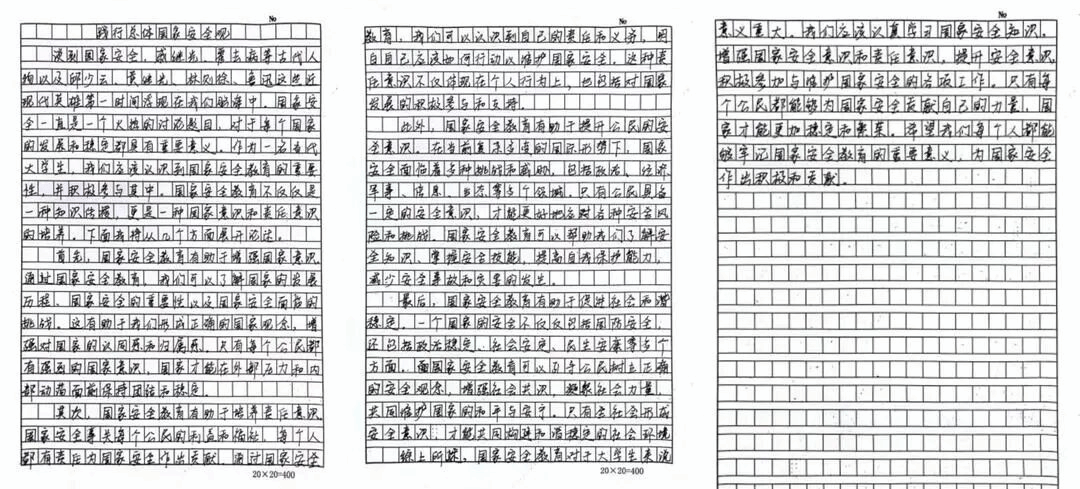 此次活动共选出一等奖作品一篇、二等奖作品两篇、优秀奖作品五篇,不仅提升了同学们的国家安全意识,还强化了他们的责任感和使命感。活动促使同学们深入思考国家安全与个人生活、社会发展的紧密联系,增强了对总体国家安全观的认知。参赛作品主题鲜明,内容丰富多样。有的同学通过讲述身边的安全故事,让大家深刻认识到安全的重要性;有的同学则从宏观角度阐述了国家安全对个人和社会的重要意义。经过激烈的角逐和严格的评审,一批优秀作品脱颖而出。这些作品不仅展现了同学们的才华和创意,更体现了他们对国家安全的深入思考和强烈责任感。