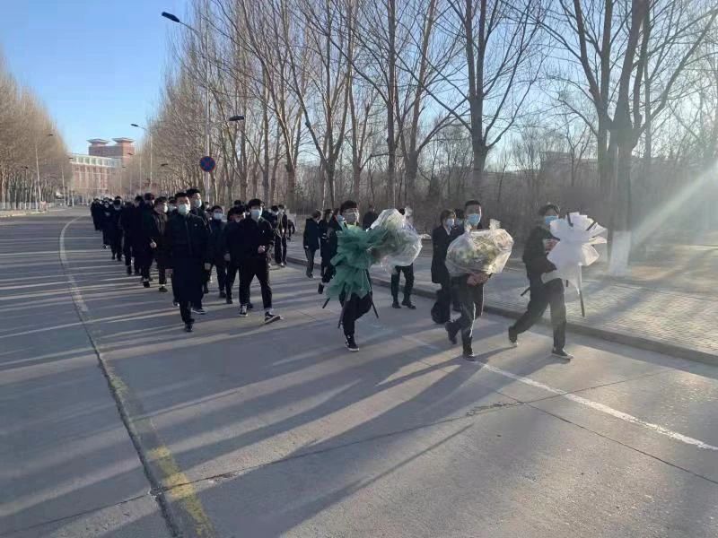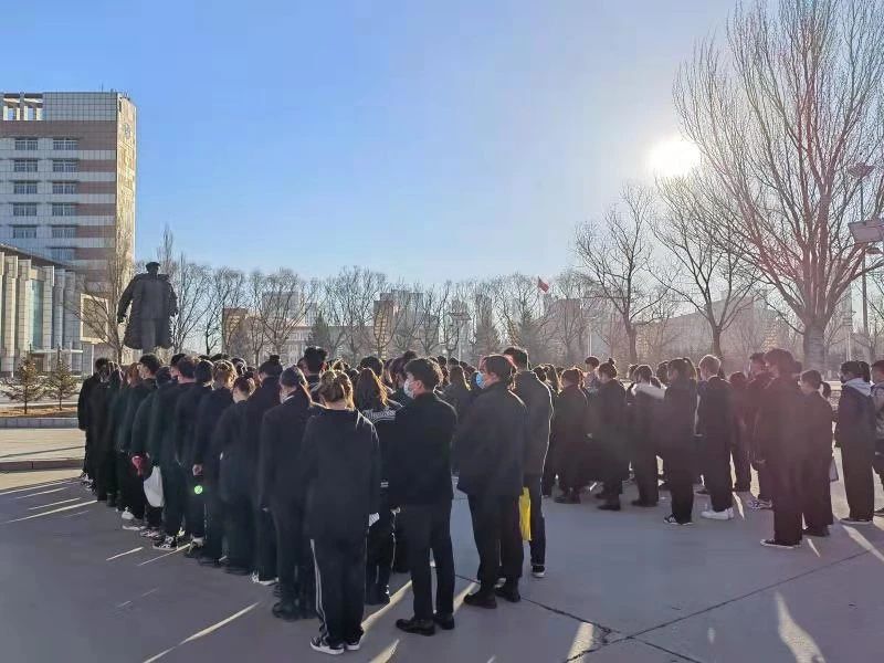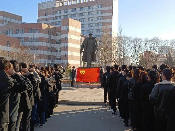 清晨的太阳冉冉升起,铁人雕像前一片肃静祥和,同学们队列整齐,神情凝重。