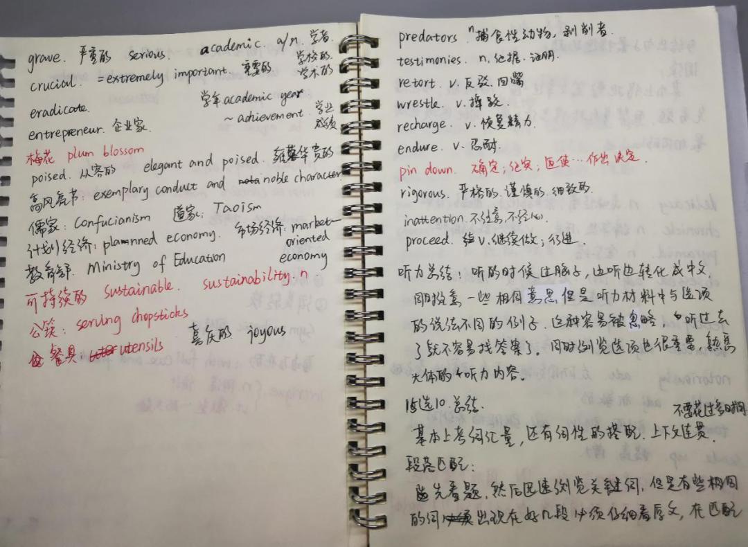 作文:首先要仔细审题,切记不能偏题。写作之前先列个提纲,把框架搭好。最好采用三段式,考前在网上多背模板和万能句。最后书写一定要工整!