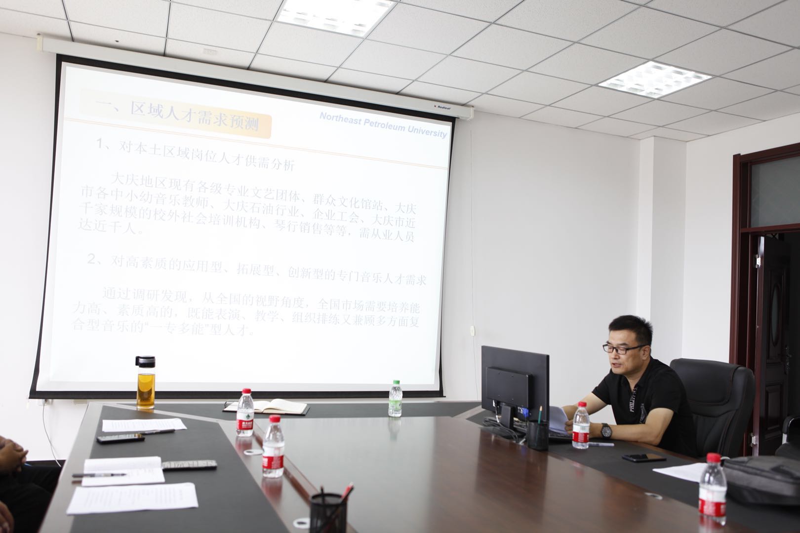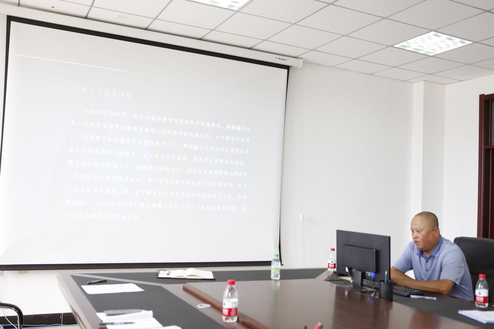 会议伊始,音乐系主任伊善斌、舞蹈系主任安立勇、美术及设计系主任王静波分别代表各系做“双论证”的论证报告主题发言。他们分别从区域人才需求预测、人才培养情况分析、人才培养战略定位、专业结构优化调整及保障措施,五个方面进行论证。随后,在场教师,结合专业实际对论证报告进行讨论、提出修改建议,观点交融互鉴,有效凝聚了推动学院高质量发展的共识,达到了激活奋进正气、激励学院高标前行的积极效果。