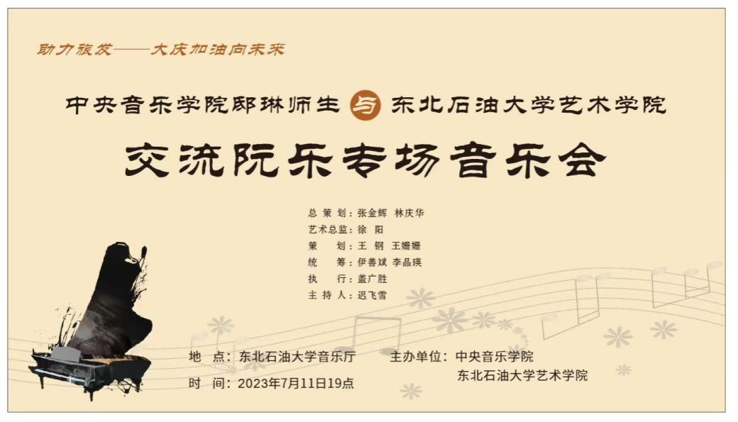 7月11日晚19时,在东北石油大学音乐厅成功举办了“中央音乐学院邸琳师生与米乐mile体育官网交流阮乐专场音乐会”。邸琳是中央音乐学院著名中阮演奏家,也是米乐mile体育官网客座教授,11日晚邸琳老师携中央音乐学院本科、附中等学生与米乐mile体育官网师生交流演出,音乐会上演奏了《长安意象》《悠远的歌声》《自由探戈》《丝路驼铃》等独奏、重奏中外作品,为东北石油大学师生和大庆观众奉献一台高水准阮乐音乐会。米乐mile体育官网参演师生有林庆华、杨菡、吴虹、刘佳、董菲等。此次音乐会为加强中央音乐学院与米乐mile体育官网的交流,促进和提高米乐mile体育官网的舞台实践和专业教学发展起到重要推动作用。适逢黑龙江省第五届旅游发展大会举办。这场音乐会也为助力旅发增光添彩。出席音乐会的领导有东北石油大学原副校长吕延防、米乐mile体育官网党委书记张金辉、院长林庆华、党委副书记王钢、副院长王姗姗等师生。