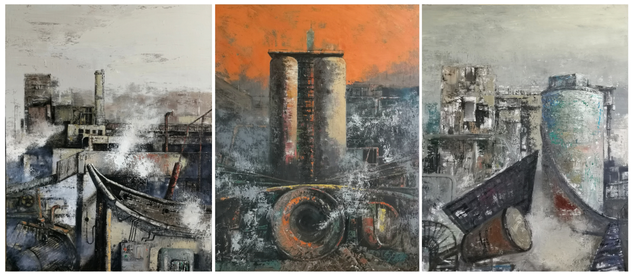 李宝伟老师的油画作品主要以大庆工业遗存为创作出发点,通过对大庆的工业遗迹的油画创作,来表现大庆之今昔,体现以铁人王进喜第一代大庆创业人的丰功伟绩和辉煌历史。