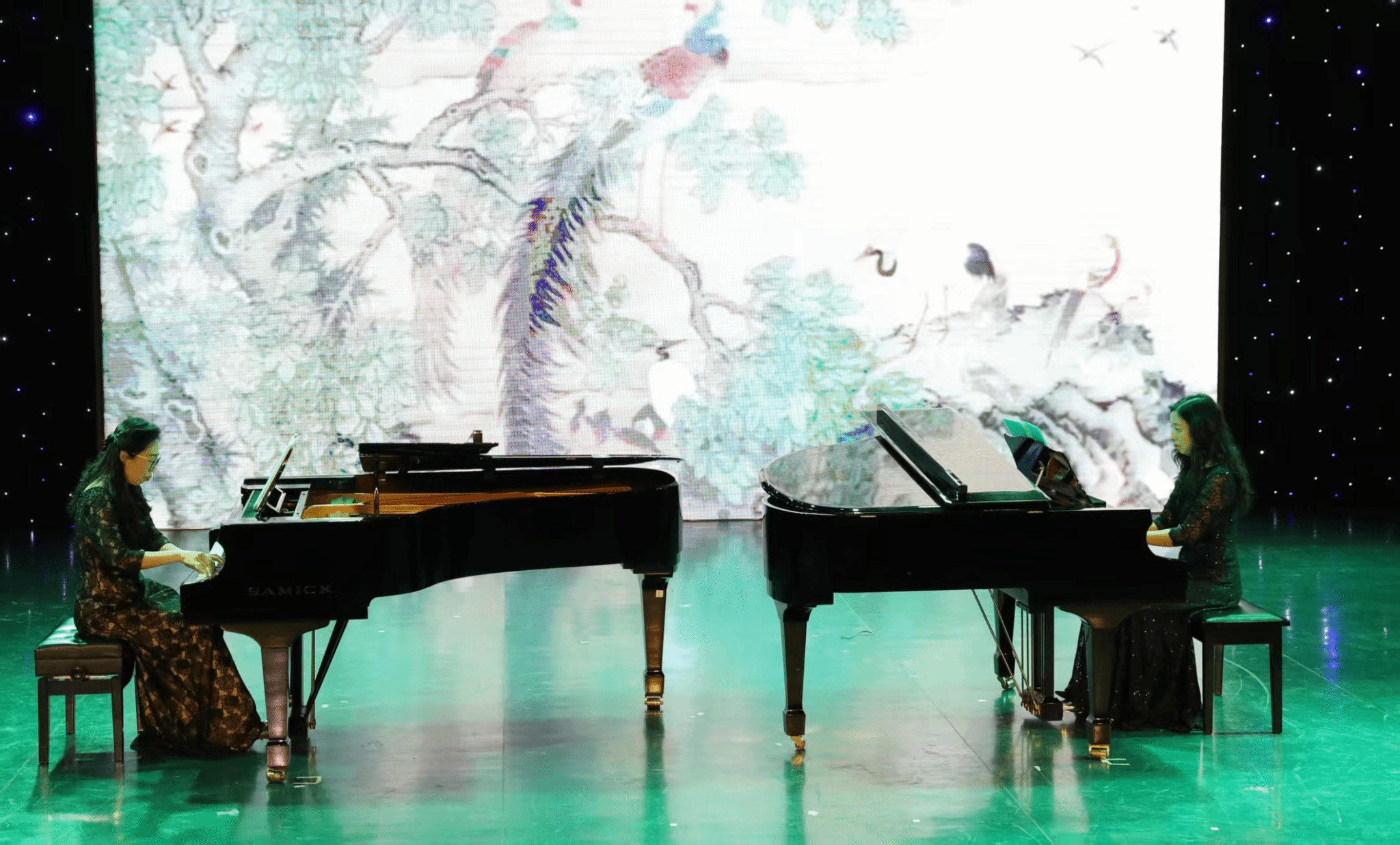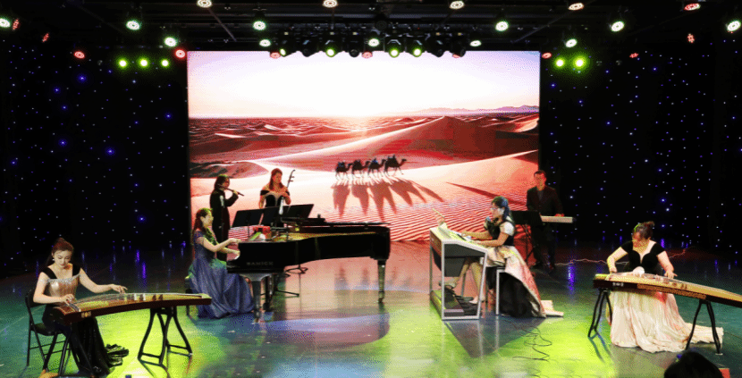 重奏《新丝绸之路》通过古筝、二胡等传统乐器与双排键和钢琴完美融合,形成古典与现代的碰撞;四手联弹《花儿为什么这样红》以塔吉克民歌为素材展现出极强的戏剧化音响;《红色童谣》用五重奏形式展现了红色精神;《圆号协奏曲》风格温暖、欢快;民乐重奏《敦煌新语》中国民族乐器与西亚音乐调式相结合,体现了敦煌传奇色彩;双钢琴《百鸟朝凤》巧妙展现“音画同构”的听觉盛宴。