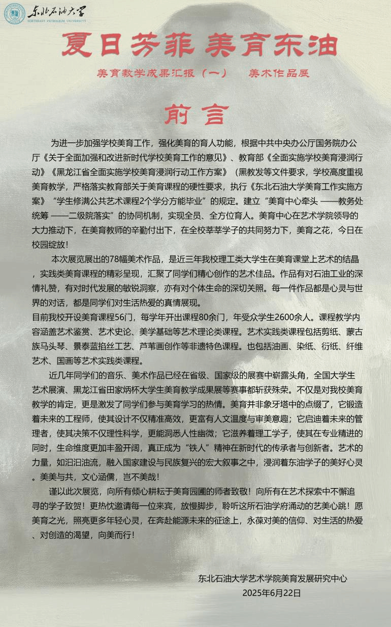 米乐mile体育官网院长林庆华表示:“本次展览不仅是对过往美育教学成果的梳理与肯定,更是面向未来的新起点。我们将持续深化美育教学改革,厚植育人沃土,以艺术之光涵养师生心灵,以创新之力服务社会发展,为培养担当民族复兴大任的时代新人贡献艺术的力量。”本次美育教学成果展将持续展出至9月份。展览开放期间,众多师生与社会艺术爱好者纷纷前来参观,观众或驻足细品画作深意,或拍照留存设计巧思,或交流探讨创作理念,沉浸于这场精心筹备的美育之约中。这场夏日的艺术绽放,不仅为东油校园增添了浓郁的文化气息,更如清泉般润泽师生心田,生动诠释了美育在立德树人、培根铸魂中的深远价值。