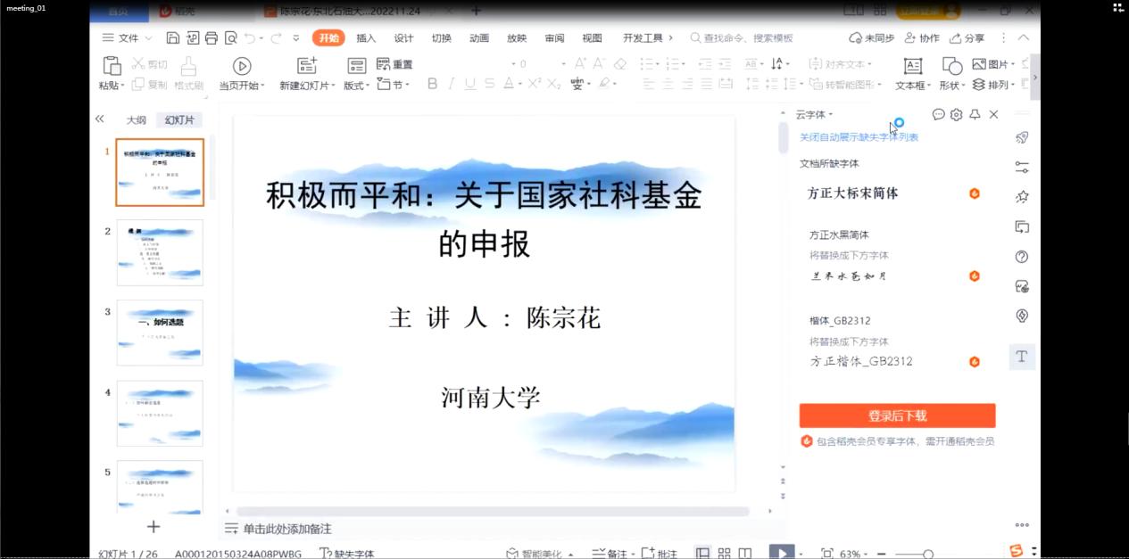 陈宗花教授以《积极而平和:关于国家社科基金的申报》为题,通过五个方面进行了国家社科基金申报书撰写过程的详细讲解。其一,论证课题一定要重文本,多下功夫,相当于写一篇顶级期刊的论文,呕心沥血地要论证好;其二,研究现状要明确定位,准确梳理,清楚表达观点;其三,前期成果要有延续性,体现出前面的积累和后续的工作;其四,课题组成员应专业领域相似,梯队搭配,最好每个成员具有相关成果,学生成员应少,无需组太多的校外成员,方便团队合作;其五,参考文献应引起重视,要选择相关性高、经典的文献。